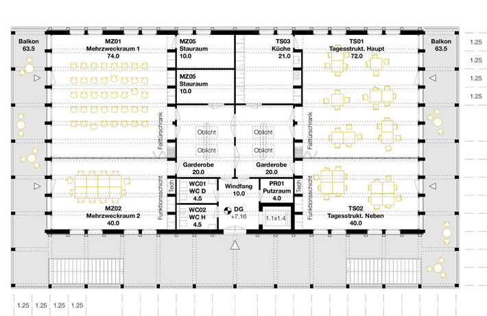 In den 3-geschossigen Neubau kommen im EG die Werkräume, im OG der Kindergarten und im DG die Tages- struktur- und Mehrzweckräume unter. Diese Nutzungen funktionieren im Schulbetrieb unabhängig voneinander und können durch ähnliche Flächenanforderungen effizient mit aussenliegenden Treppenanlagen gestapelt werden. Eine Serviceschicht mit Windfang, Lift, Nasszellen und Putzraum zieht sich durch alle 3 Geschosse und wird synergetisch genutzt.